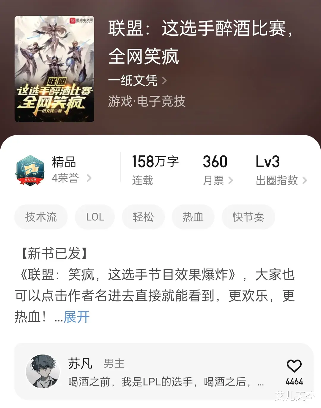 不过能写到万订,自然也是有过人之处的,只是我不是这类小说的爱好者,感兴趣的就只能大家自己去探索了。作者新书还是LOL文,已经几万字了。