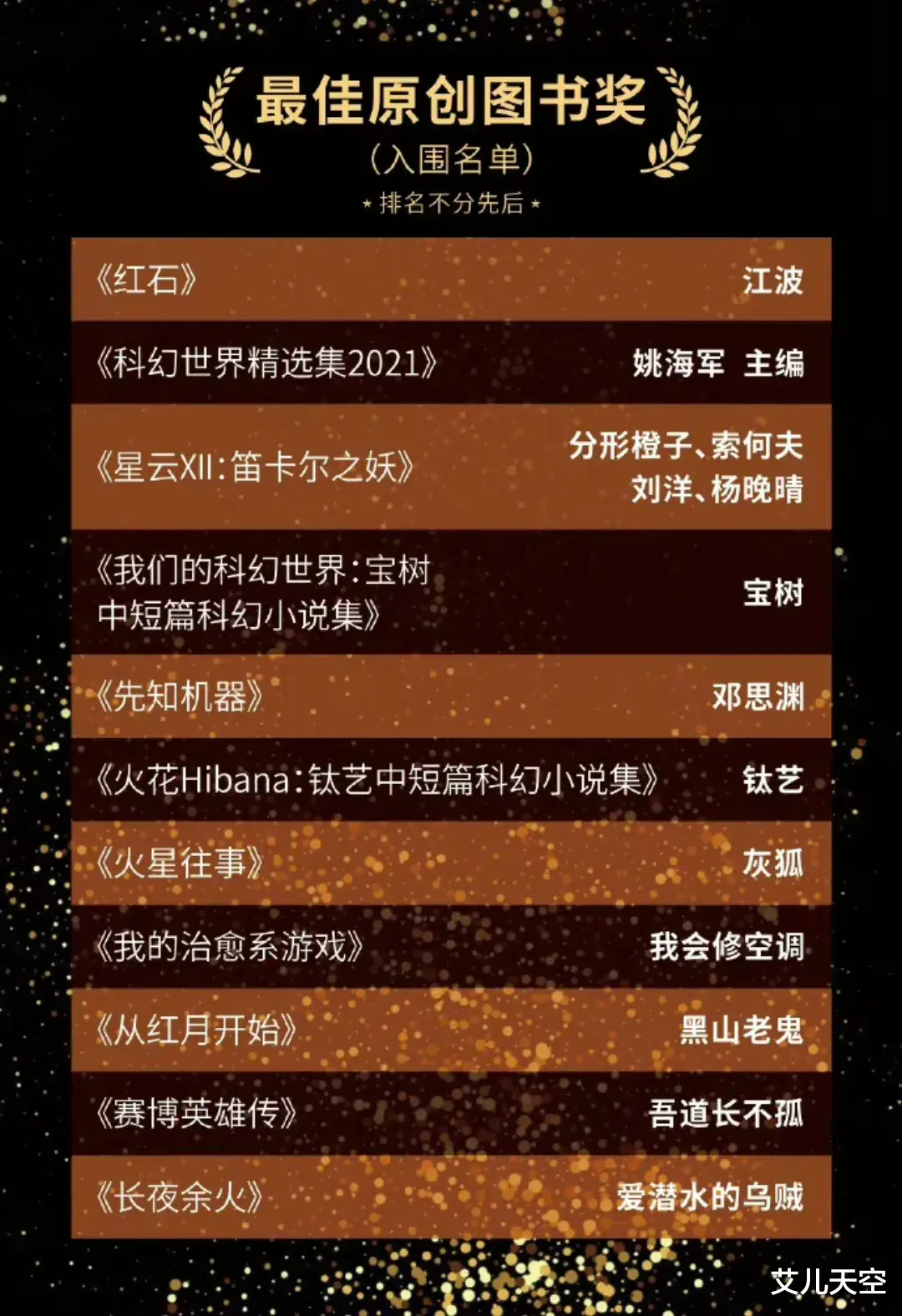 我会修空调的《我的治愈系游戏》、黑山老鬼的《从红月开始》、吾道长不孤的《赛博英雄传》、乌贼的《长夜余火》。黑山老鬼这是入围了两项了,转到科幻这一块,荣誉这一块确实要更多一些。