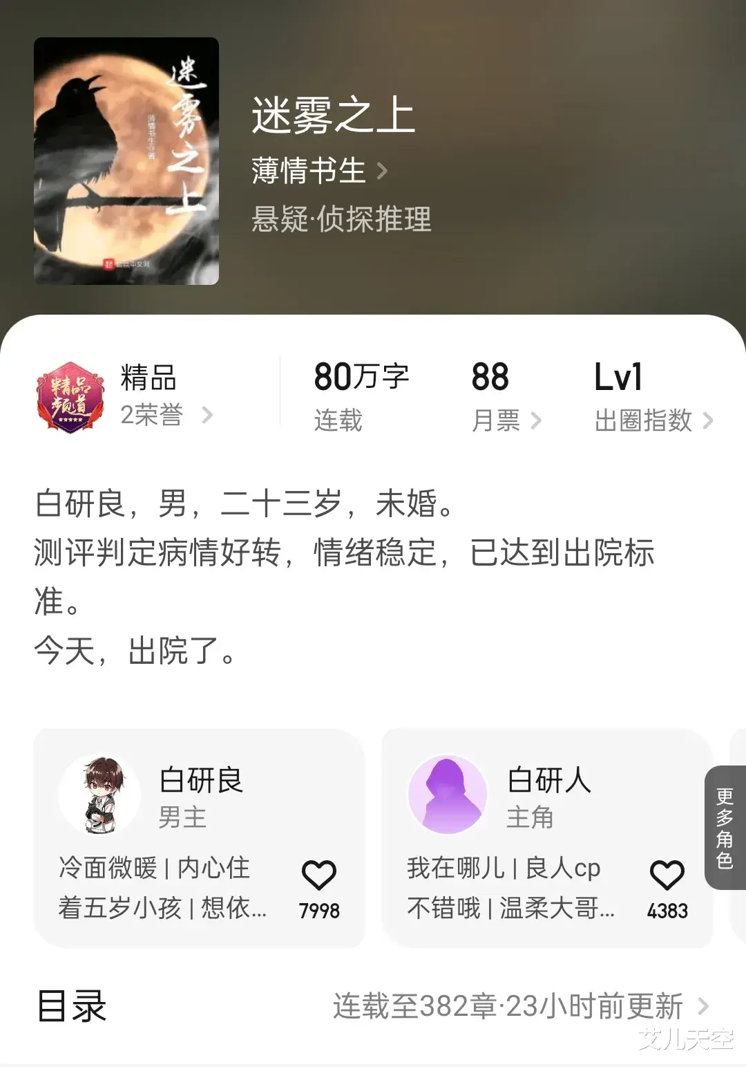 只是那个时候薄情书生已经在写新书《怪谈玩家》。现在玩家也完结有段时间了,这本《迷雾之上》也就重新捡起来开始复更了。对这本小说还有念想的可以去看看。