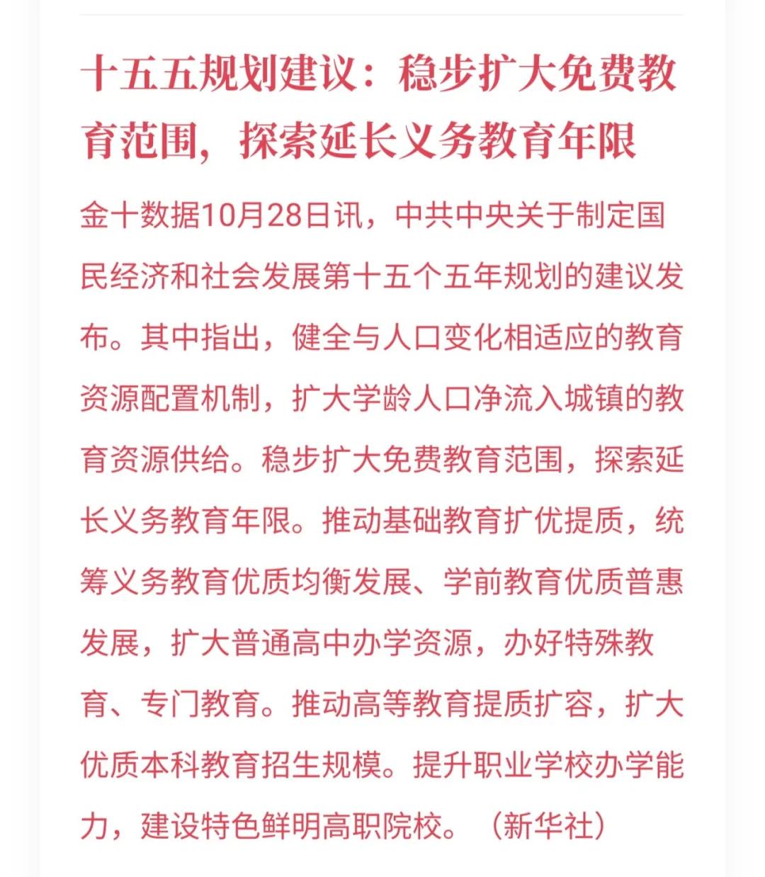 规划建议提出,稳步扩大免费教育范围,探索延长义务教育年限。