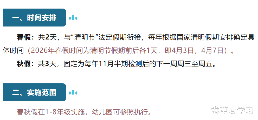 例如北京地区,将春假安排在清明节前后各1天,甚至还官宣了秋假的放假安排。