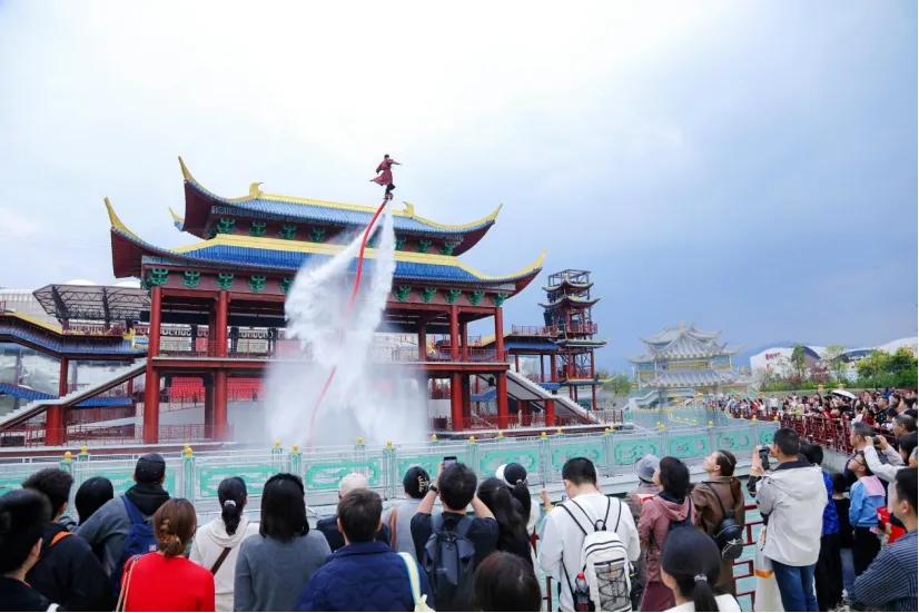 成都梦回青城·演艺小镇由融创文旅打造,以《梦回青城》和《马超镇守都江堰》两大顶级实景演艺为核心,搭配国风仙侠、黄金巨马、花魁及熊猫四大主题巡游,日均呈现超100场氛围互动演出,还配套多项大型游乐设备,为游客提供全龄段、全天候的沉浸式游玩体验。
