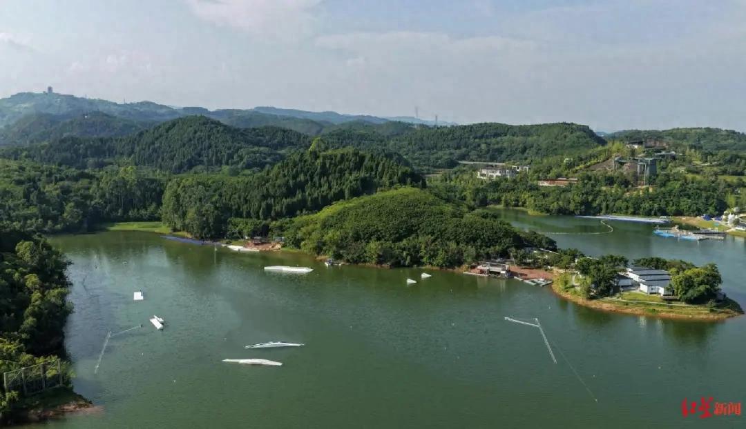 熊猫索道滑水公园位于三岔湖马鞍山码头旁,是2025年成都世运会索道滑水项目的比赛场地,如今已正式向市民游客开放。公园整体水域面积超过200亩。