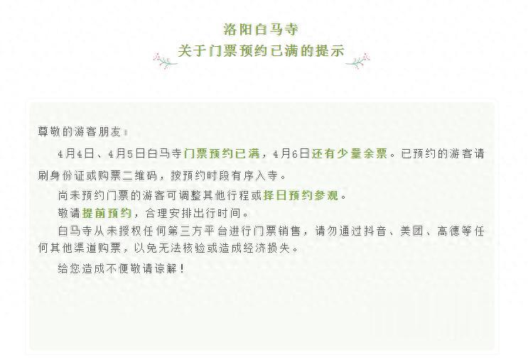 4月2日,记者从洛阳白马寺了解到,4月4日、4月5日白马寺门票预约已满,4月6日还有少量余票。已预约的游客请刷身份证或购票二维码,按预约时段有序入寺。尚未预约门票的游客可调整其他行程或择日预约参观。