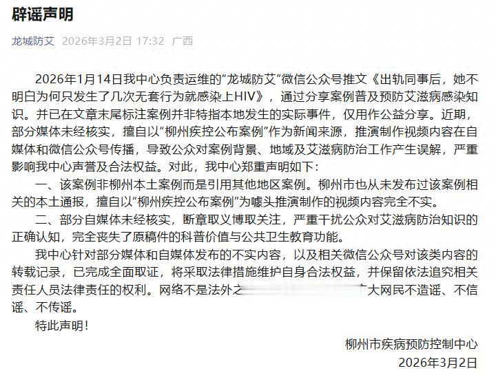 2026年1月14日我中心负责运维的“龙城防艾”微信公众号推文《出轨同事后,她不明白为何只发生了几次无套行为就感染上HIV》,通过分享案例普及预防艾滋病感染知识。并已在文章末尾标注案例并非特指本地发生的实际事件,仅用作公益分享。近期,部分媒体未经核实,擅自以“柳州疾控公布案例”作为新闻来源,推演制作视频内容在自媒体和微信公众号传播,导致公众对案例背景、地域及艾滋病防治工作产生误解,严重影响我中心声誉及合法权益。对此,我中心郑重声明如下: