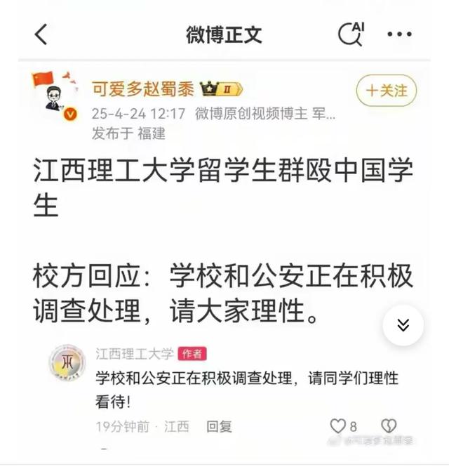 我们来回顾一下江西理工大学留学生事件。据报道,2025年4月23日晚,一名中国学生在学校附近的健身房使用器械时,遭到一名外籍留学生的无理挑衅和暴力攻击。随后,该外籍留学生还召集同伴对中国学生进行围堵和群殴,导致中国学生面部多处受伤,伤势严重。这一事件迅速在网络上发酵,引发了公众对留学生管理、教育主权以及法治观念等问题的深刻讨论。