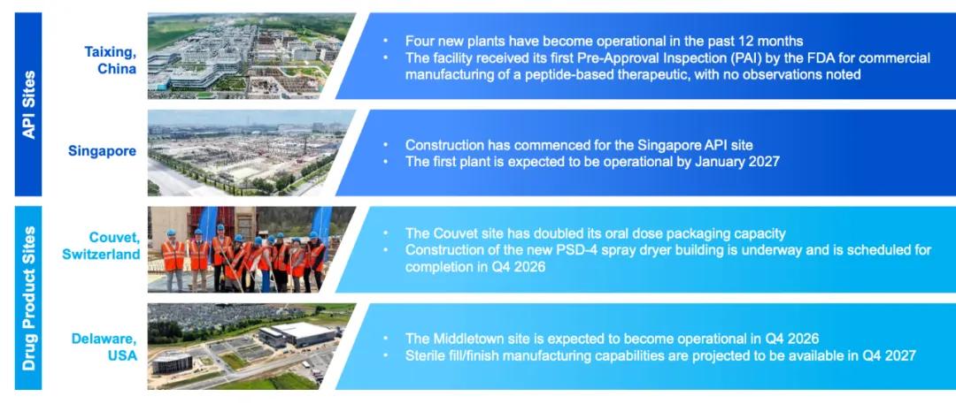 2022年,其美国特拉华州的米德尔顿打下地基。这个基地占地面积高达77 万平方米,目前已完成建筑主体,进入内部安装阶段,预计将于2026年底前投入运营。米德尔顿基地未来也将为全球药企提供从临床前到商业化阶段的制剂开发与生产服务。