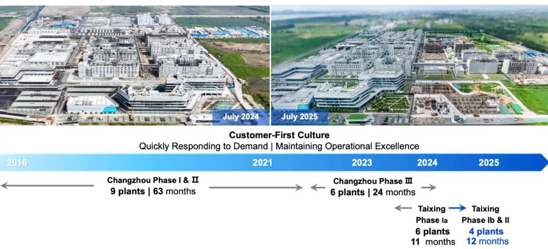 常州基地从2016年第一个车间投入使用,一期和二期共计9个车间,耗时5年全部建设并投入使用,这速度在业界已属不俗。而到了三期,6个车间仅用两年便投入使用。在后起之秀的泰兴基地,一期6个车间、二期4个车间,更是分别只用了一年时间就投入使用,显著的规模效应让产能爬坡像个越转越快的“飞轮”。