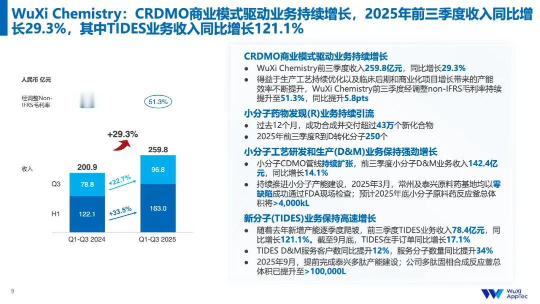 而据公开信息,药明康德早在2011年就布局了多肽研究和测试能力;2018年整合并推出新分子业务板块WuXi TIDES,专注于提供寡核苷酸、多肽及相关化学偶联物的“端到端”CRDMO服务。今年前三季度,TIDES业务收入达到78.4亿元,同比大增121.1%,截至9月底,TIDES在手订单同比增长17.1%。