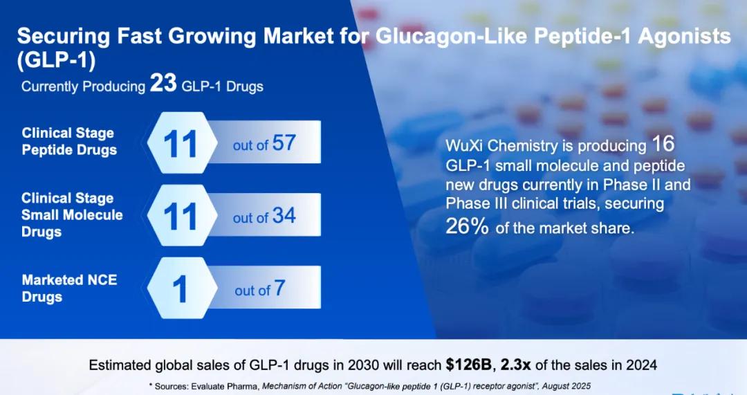 由此,药明康德早已成为GLP-1领域不可或缺的“赋能者”——在今年9月举办的投资者开放日活动上,药明康德披露,全球有近百款GLP-1激动剂处于临床在研阶段或业已上市,其中23款由药明康德化学业务平台支持,包括11款多肽类候选药物和11款小分子候选药物。