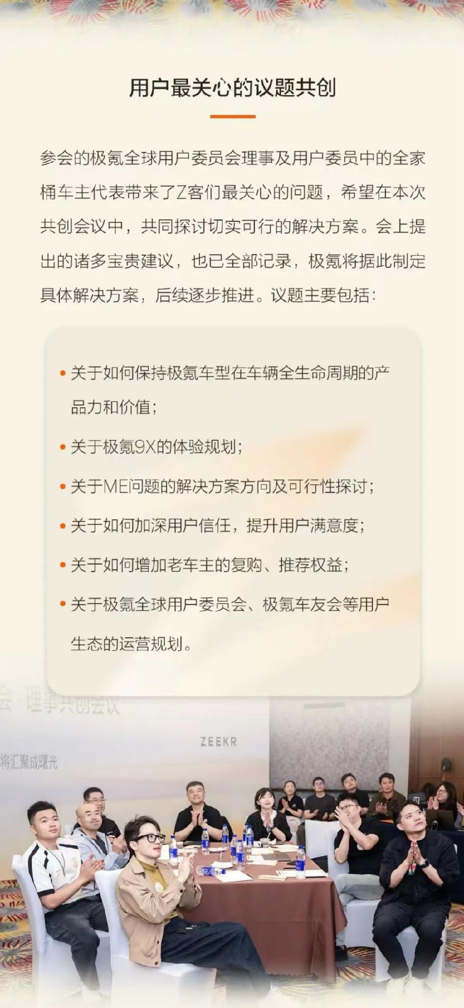 不知道大家还记不记得,今年9月极氪在丽江开了一场“全球用户委员会-理事共创会”,由吉利集团副总林杰亲自带队,研发、售后、用户运营的高层管理都参与了,当然,这次见面不只是听用户意见这么简单,而是将品牌的现状,以及企业的诚意表达清楚。