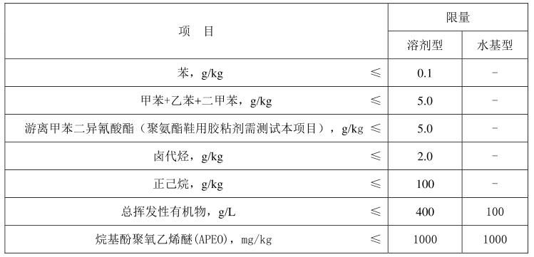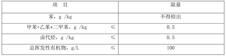 苯、甲苯、乙苯、二甲苯、游离甲苯二异氰酸酯、卤代烃、正己烷、总挥发性有机物(VOC)、烷基酚聚氧乙烯醚(APEO)应符合以下限量要求。