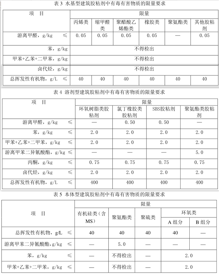 可以分为水基型建筑胶粘剂、溶剂型建筑胶粘剂和本体型建筑胶粘剂三大类。不同类型的产品限量要求有所区别,核心指标都是苯、甲苯、乙苯、二甲苯、总挥发性有机物(VOC)等,具体应符合以下限量要求。