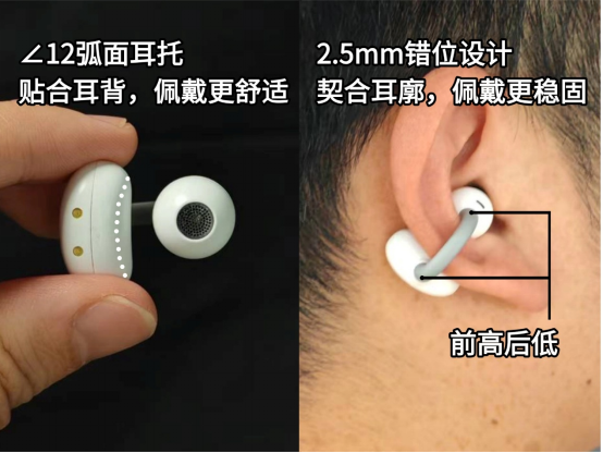 从耳机的佩戴设计就能看出这款耳机是非常用心的,结构上采用了前高后低的 2.5mm 错位设计,让耳机能完美的融入耳朵轮廓,戴起来非常稳固;电池部位还被设计成∠12 弧面耳托,恰好贴紧耳背,戴起来不仅贴耳还很舒服。更惊喜的是单耳仅有4.5g,佩戴轻盈无负担,长时间不会给耳朵带来压迫感。