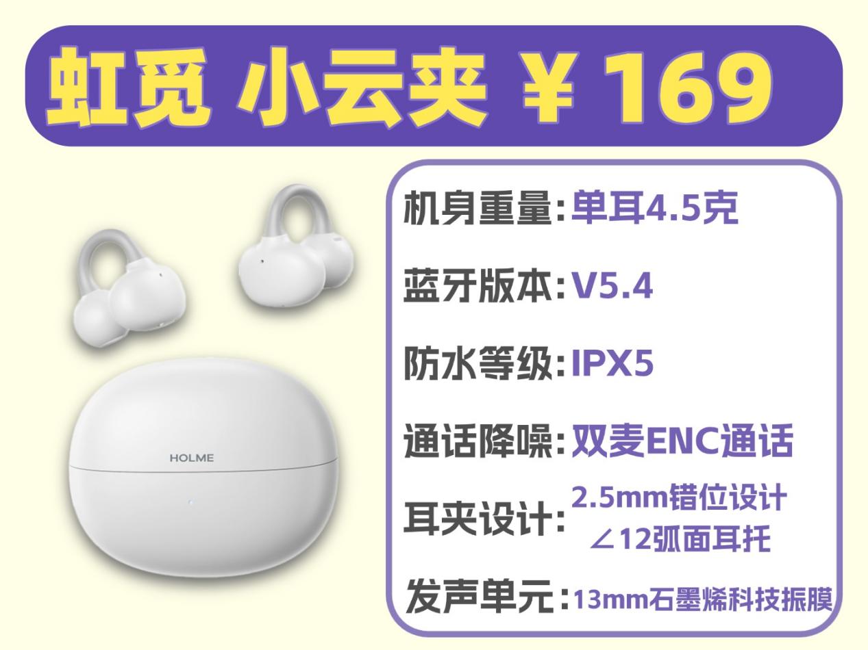 性价比耳夹式耳机推荐虹觅HOLME Air2小云夹价格:169 元推荐理由:百元档性价比最高,佩戴最舒适且防漏音最强的耳夹式耳机