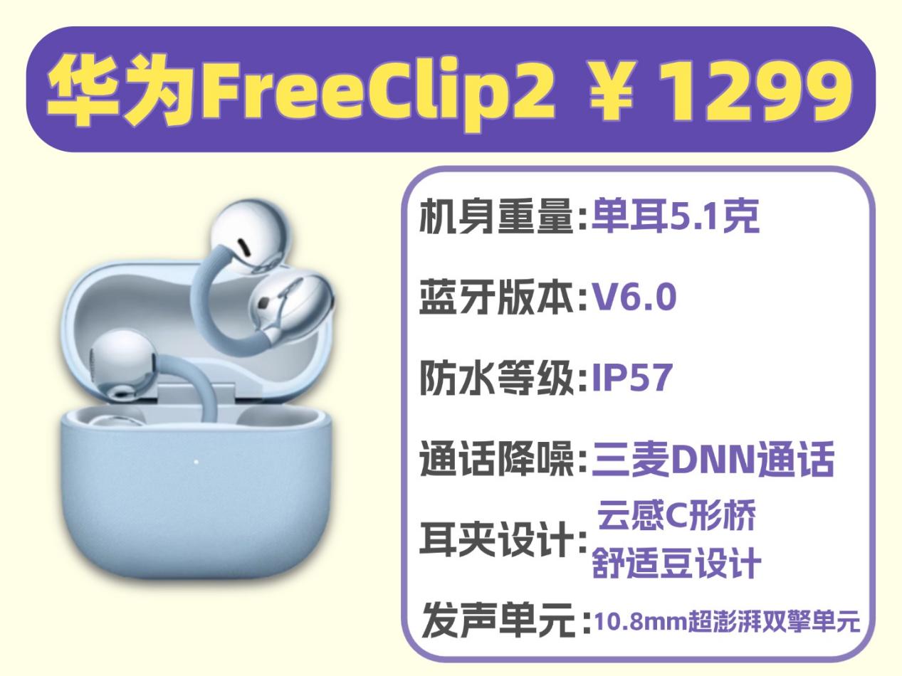 华为FreeClip2价格:1299 元推荐理由:各方面表现均十分出色,没有明显短板,音质与佩戴体验都在线