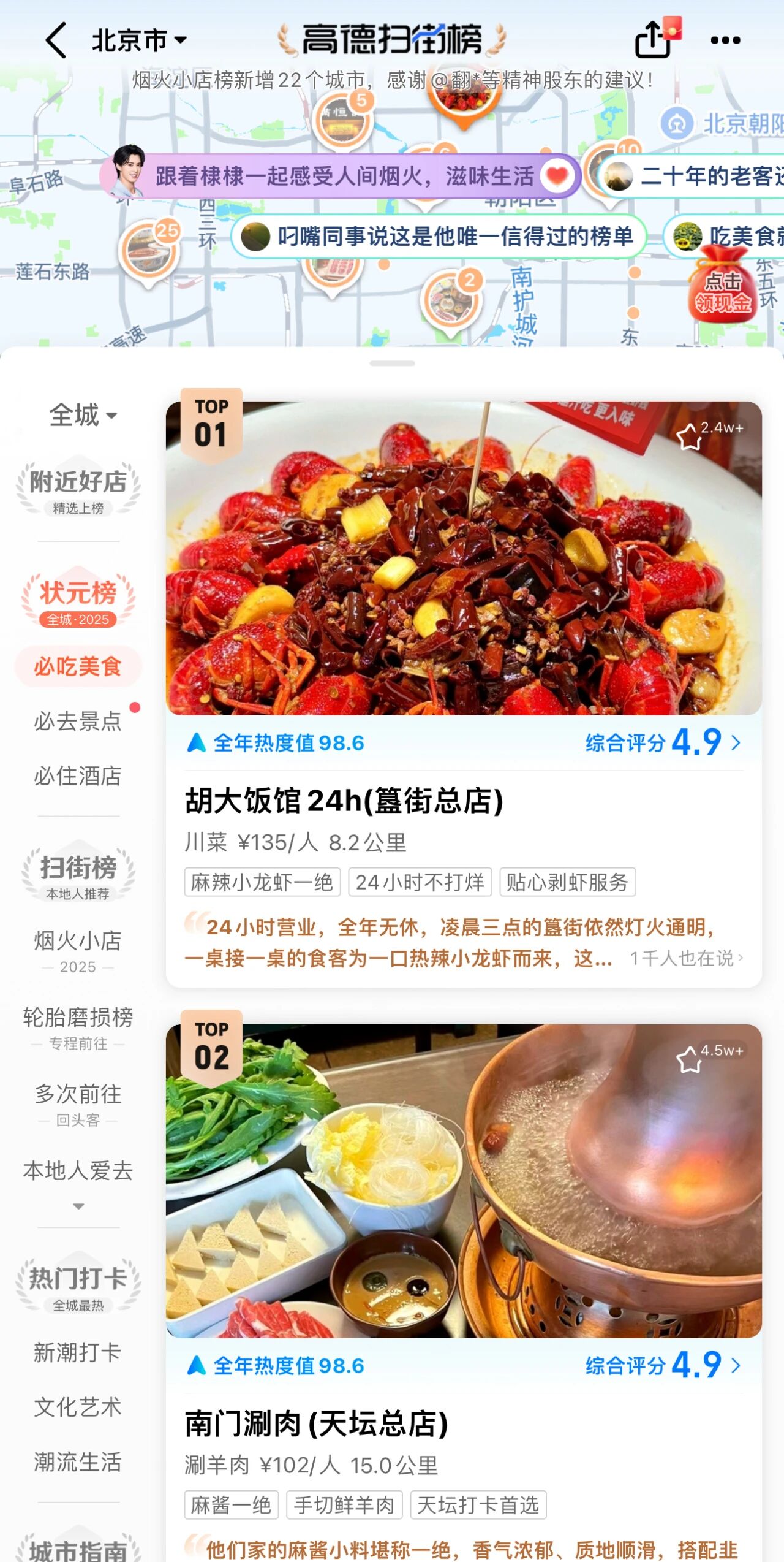 而高德地图的天然场景是“我在路上,我要去某个地方,或我到了某个地方附近”。它的逻辑是“路径规划+目的地服务”。“高德扫街榜”基于真实导航、搜索、交易行为生成,有效过滤噪声数据。这种“行为即评价”的模式,削弱了传统刷评机制的影响,推动行业从“营销导向”回归“服务本质”。