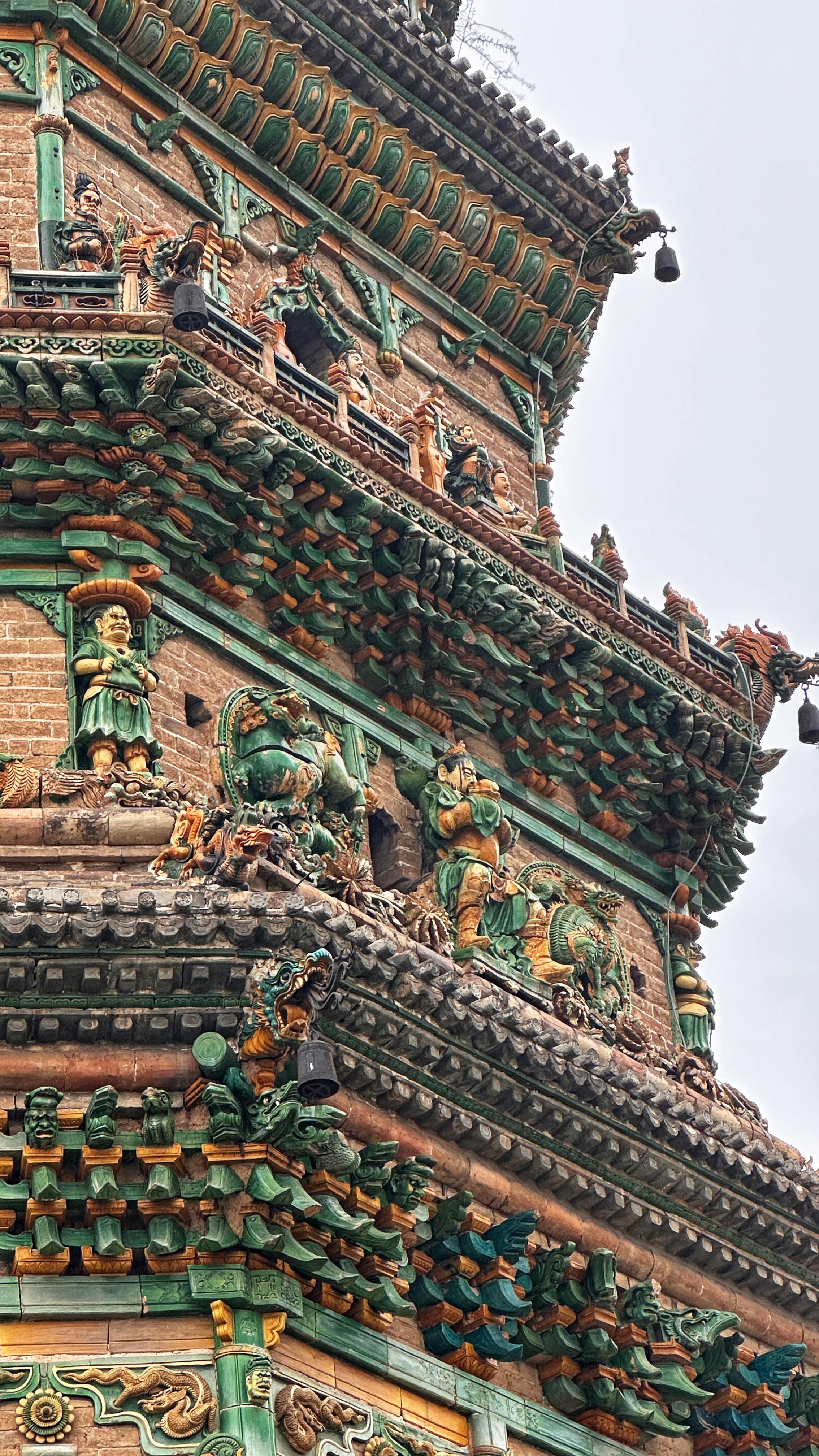 色彩的运用堪称东方美学的巅峰实验。黄、绿、蓝三彩的配比遵循"五行相生"原理:底层的孔雀蓝琉璃对应"水德",向上渐次过渡为翡翠绿(木)、柠檬黄(土),顶层的鎏金刹尖象征"火"与"金",形成完整的五行闭环。更妙的是琉璃表面的"冰裂纹"肌理,这并非烧制失误,而是工匠刻意通过温差控制形成的自然纹路,在不同角度的光线中,会产生"碎金"般的漫反射效果,使整座塔如悬浮的彩虹棱柱。