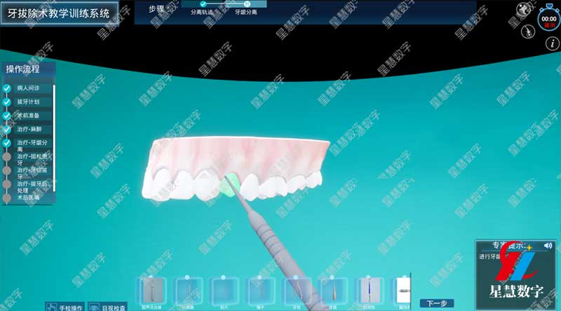 系统随后引导学生进行单项技能训练,如局部阻滞麻醉、牙龈分离、牙挺及牙钳的选择和使用等。每个环节都有详细的操作指导和实时反馈。