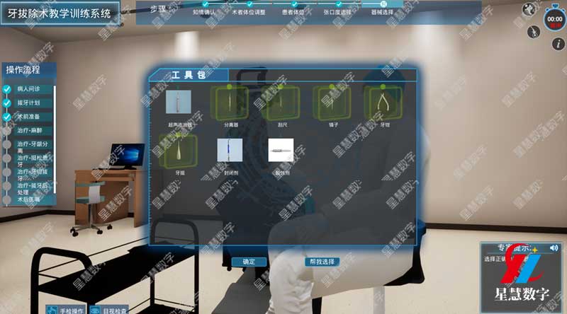 在掌握基础技能后,学生进入综合训练模块,系统模拟完整的临床拔牙过程,包括病例查看、工具选择、椅位调整和拔牙操作。帮助学生逐步提升拔牙实训技能。