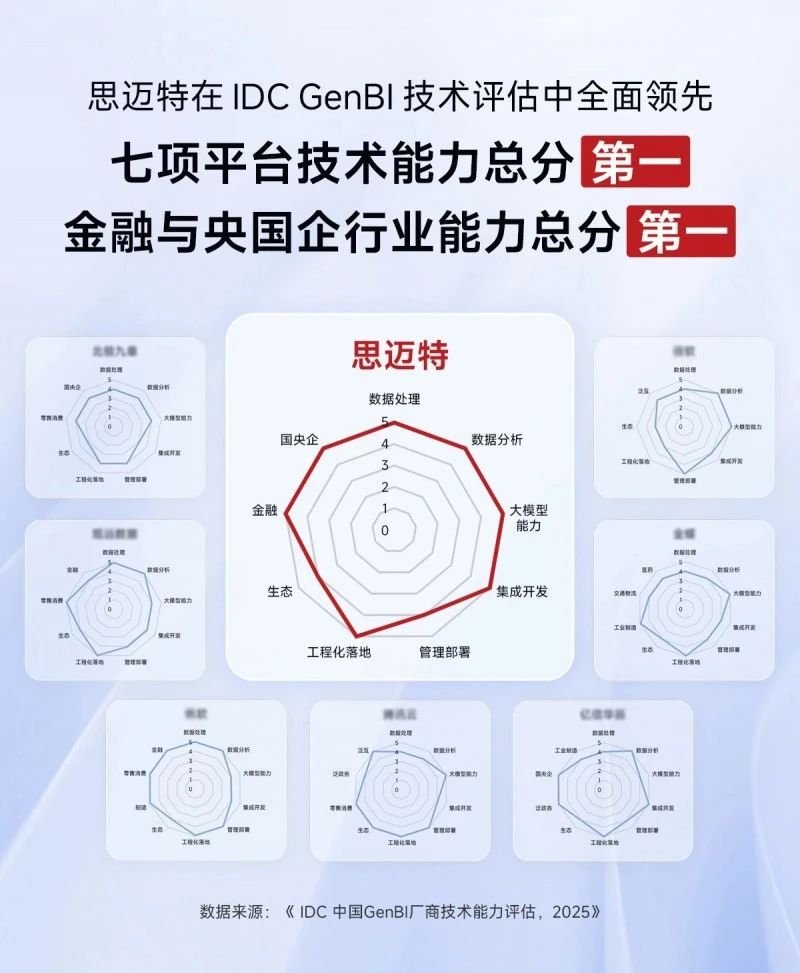 IDC强调,金融与央国企等头部行业的GenBI应用已进入"自主决策"阶段,这对厂商的行业Know-how提出极高要求。思迈特在这两大领域的满分表现,源于其"技术+业务"的双轮驱动模式。