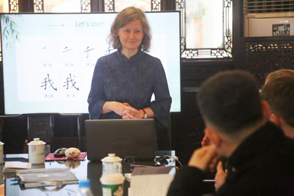 沙龙的实操互动环节尤为精彩。爱卡老师从自我介绍切入,Hi! My name is Ilka. I'm from Germany. I like it here. Nice to meet you,带领大家学习“我叫……”“我来自……”“我是……国人”“我很喜欢这里。”等表达。随后,她逐句讲解“嗨!”“你好!”“你叫什么名字?”“你是哪里人?”“认识你很高兴!”等日常问候,以及“您好!”“幸会幸会!”“您贵姓?”等正式场合用语,并对发音和声调技巧进行了细致指导。她还提醒学员,用中文介绍我来自什么地方的时候遵循“先大后小”的语序特点。现场学员两两互动、轮流练习,在反复表达中熟悉句式、把握声调,切身感受中文表达的乐趣。
