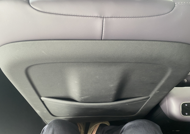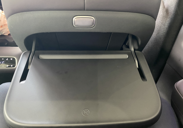 跟理想一样只在副驾背后设置了一个小桌板,与理想不同的是,开启按钮面积设计得非常大,这值得好评,不像很多车的小桌板开启按钮太窄都会硌手指。桌上有提示不能放烫人的热饮的提示符号。