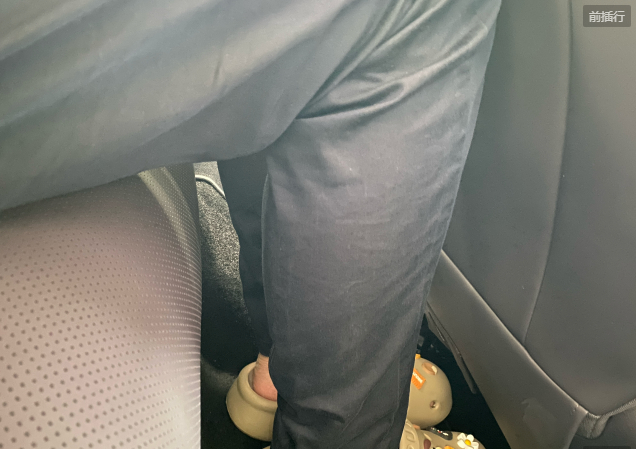 这是零跑第一次开发三排六座的SUV,在三排空间这里,整车有一键控制,让三排自动留出乘坐空间,比较方便。但是当三排留出一掌厚度的膝盖空间时,乘坐姿态如下图。