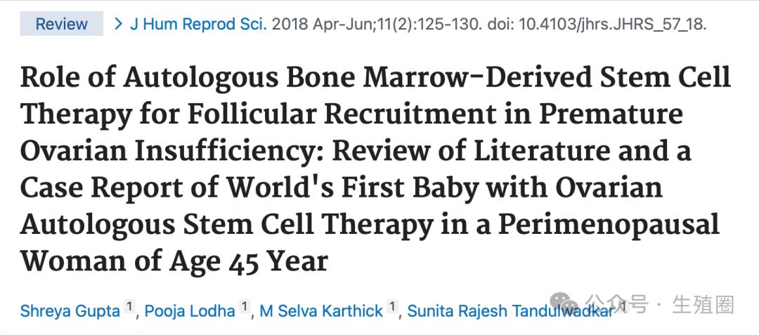 Role of Autologous Bone Marrow-Derived Stem Cell Therapy for Follicular Recruitment in Premature Ovarian Insufficiency: Review of Literature and a Case Report of World's First Baby with Ovarian Autologous Stem Cell Therapy in a Perimenopausal Woman of Age 45 Year. J Hum Reprod Sci. 2018 Apr-Jun;11(2):125-130. doi: 10.4103/jhrs.JHRS_57_18.