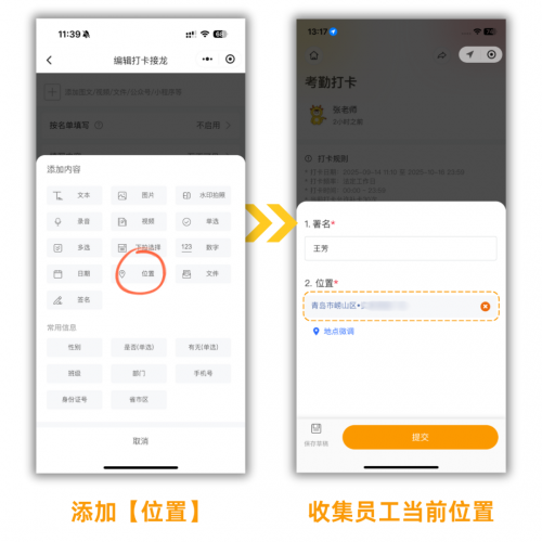 只需添加【位置】表单项,员工打卡时,需提交当前定位,无法修改,管理者可以根据位置确定员工是否抵达工作地点。