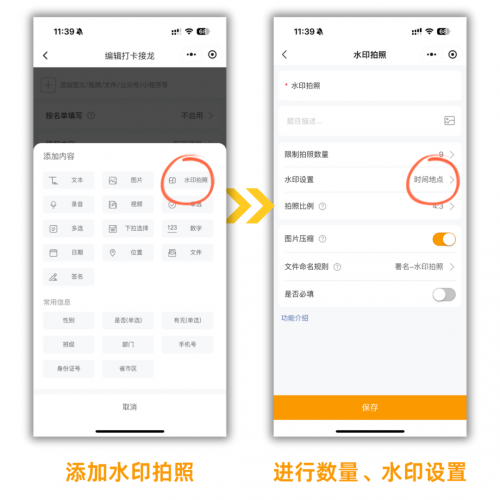 添加【水印拍照】表单项,根据需求选择合适的模板,进行编辑。