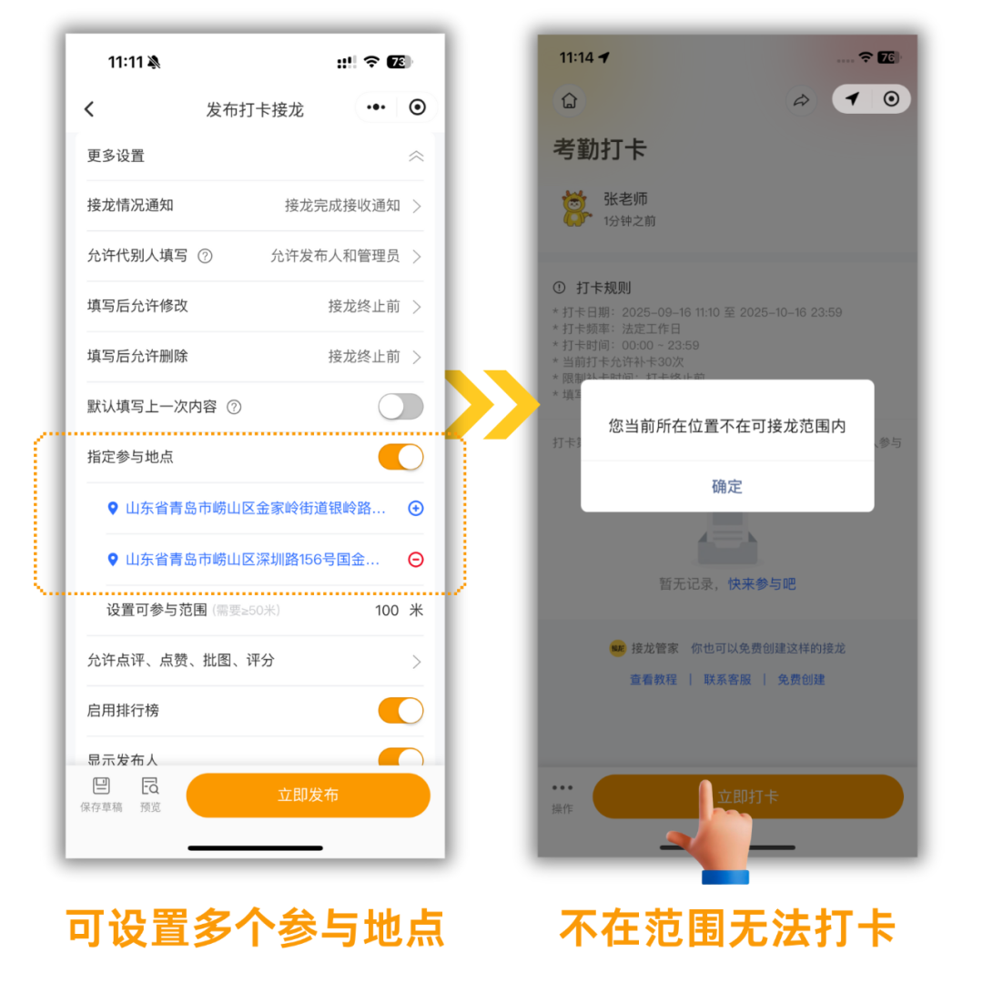 还能实现禁止代打卡,一人只能打卡一次,无法替别人打卡。