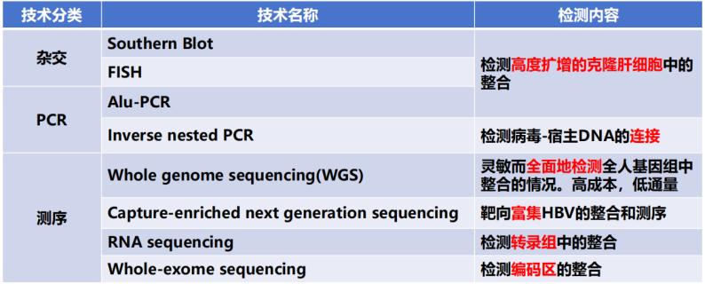 总结与展望HBV DNA整合在感染早期即可出现,并贯穿感染全程,是肝癌发生的重要因素之一。通过促进癌症相关基因表达、增加染色体不稳定性及表达截短型HBV蛋白等机制,促进肝癌发生发展。近年来,测序相关的先进的检测技术提升了检测HBV整合的能力,为临床研究提供了重要支持。