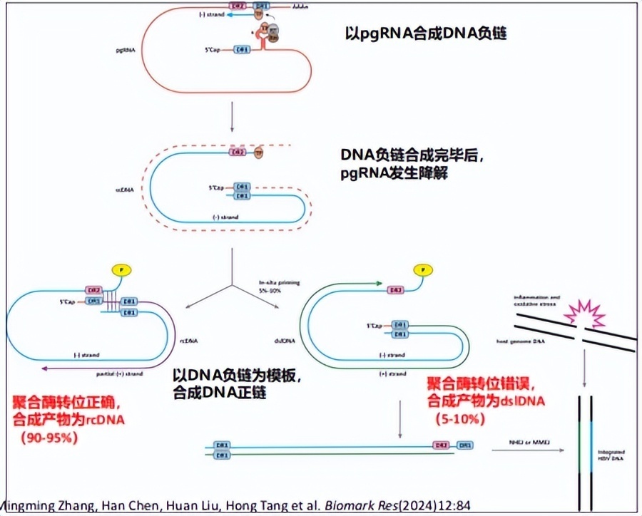 HBV DNA整合的分子机制及特点HBV DNA整合是指HBV的部分或全长基因组片段插入到宿主DNA中的过程,整合的HBV DNA来源于线性双链DNA(dslDNA)。总的来说,乙肝病毒DNA的整合过程遵循“复制错误-修复异常-整合发生”的三步逻辑链(图1)。这一过程始于病毒基因组的复制环节[3]:HBV病毒颗粒进入肝细胞后,松弛环状DNA(rcDNA)被修复形成共价闭合环状DNA(cccDNA),cccDNA转录生成前基因组RNA(pgRNA);以pgRNA作为模板,逆转录合成HBV负链DNA,聚合酶准确转位则进一步合成HBV正链DNA形成松弛环状DNA(rcDNA);如果聚合酶发生错误转位,则会导致线性双链DNA(dslDNA)的产生,而这正是病毒DNA整合入宿主染色体的关键中间体(图2)。