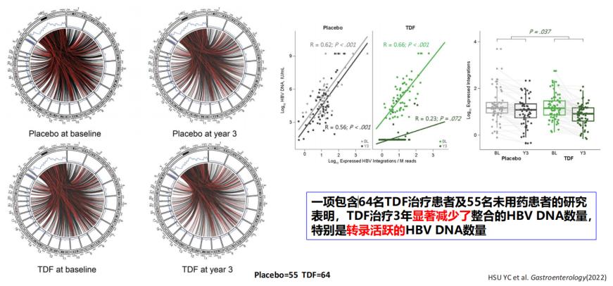 核苷类药物(NAs)NAs的作用主要为抑制HBV DNA聚合酶功能,减少病毒复制,进而减少新的HBV DNA整合。中国台湾学者的一项研究显示[20],接受NAs治疗3年的患者,肝细胞内HBV整合序列数量平均下降67%,特别是转录活跃的HBV DNA数量显著下降,有效延缓了整合相关肝损伤的进展(图8)。不过,这类药物只能减少新整合,无法清除已经整合到宿主基因组中的病毒序列。
