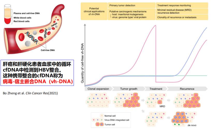 近年来,在探索HBV DNA整合的无创生物标志物过程中发现,肝癌和肝硬化患者血浆中的循环cfDNA中可检测到HBV整合,这种携带整合的cfDNA称为vh-DNA[10]。由于cfDNA主要来源于死亡的肿瘤细胞,非肝癌肝组织释放的cfDNA显著低于肝癌组织。因此,vh-DNA可用于监测肝癌进展过程中的HBV整合,也可以作为监测残余肿瘤细胞和预测复发的生物标志物(图4)。