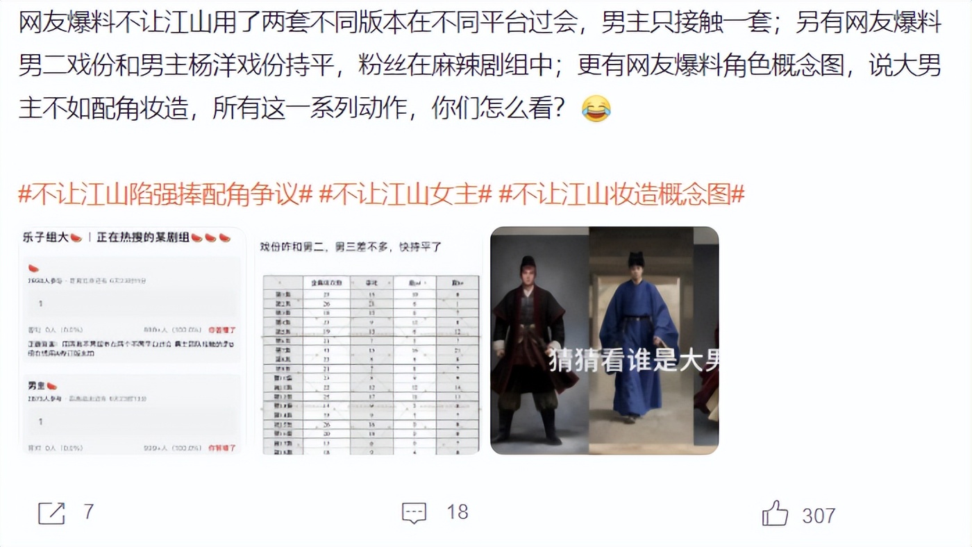 紧接着,“不让江山陷强捧配角争议”话题登上热搜,根据知情人士透露,《不让江山》用两套不同版本在不同平台过,男主接触一套,还有消息称男二的戏份将和男主持平,甚至会分掉男主的高光时刻。
