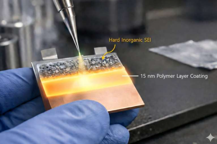由李镇宇教授和任成甲教授领导的研究团队,采用引发化学气相沉积工艺,在电池的铜集流体上形成了一层约15纳米厚的人工聚合物层。该层能够调节电解质反应,引导形成稳定、坚固的无机固体电解质界面膜,抑制了电解液的过度消耗和锂枝晶的生长,从而提升了电池循环寿命。