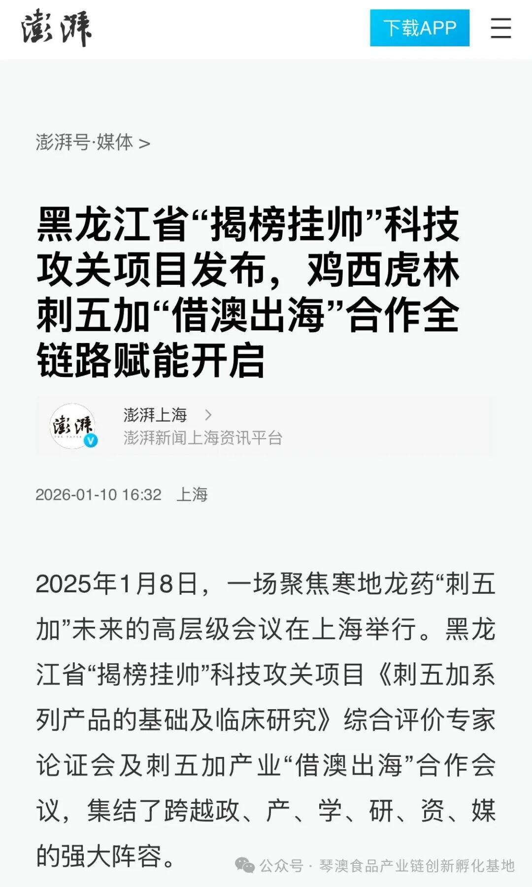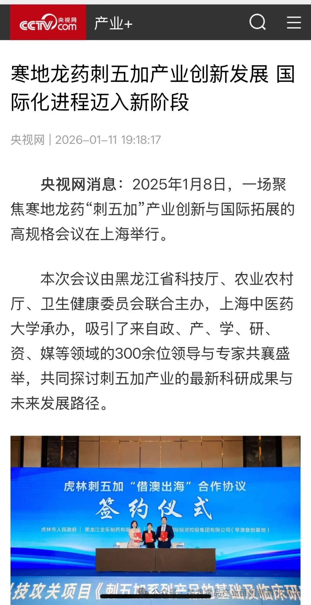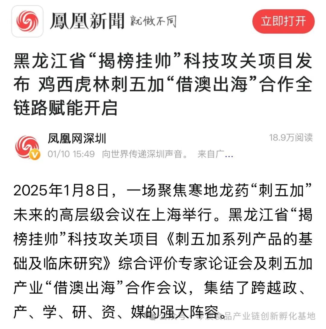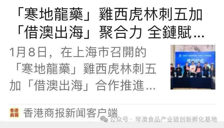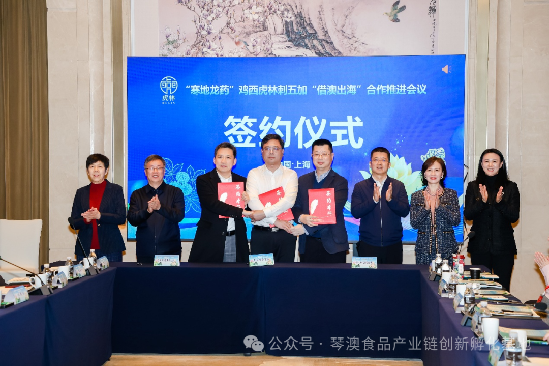 发布落地链路,发起专项基金,升级创新联盟,绘就产业蓝图……1月8日在上海市召开的“寒地龙药”刺五加“借澳出海”合作推进会(以下简称推进会)上,琴澳食品产业链创新孵化基地、虎林市政府(暨黑龙江虎惠投资管理集团公司)、黑龙江全乐制药有限公司代表刺五加产业联合体就刺五加“借澳出海”公司成立进行签约;琴澳食品产业链创新孵化基地、虎林市人民政府、上海梦想成真公益基金会签订了刺五加产业“借澳出海”公益基金赋能战略合作项目,“寒地龙药”之首刺五加“借澳出海”迈出关键一步。