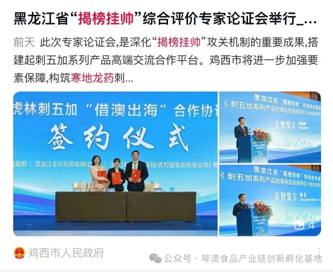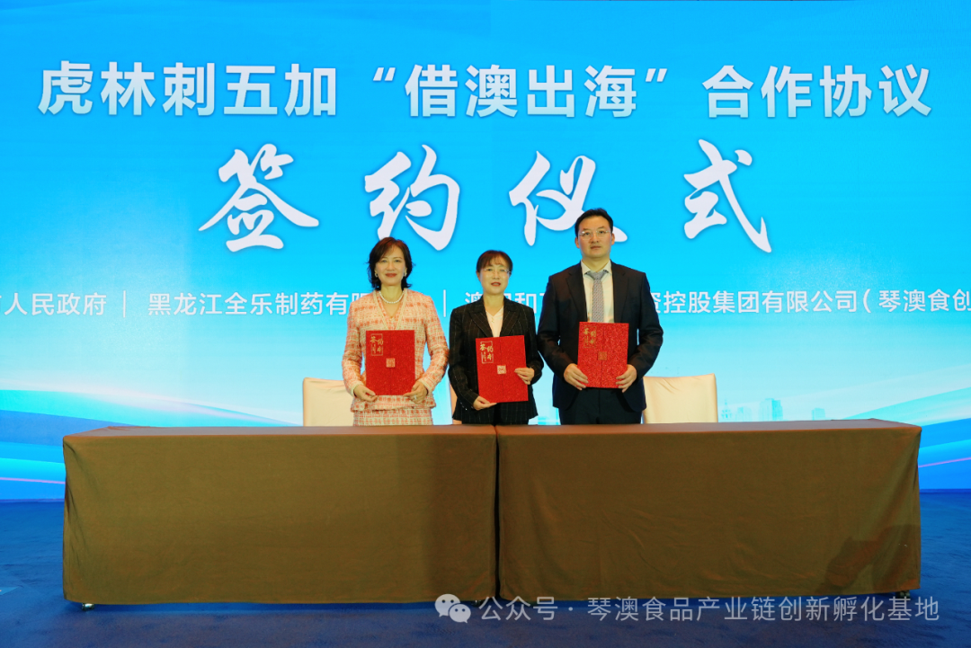 专家论证会现场还举行了虎林刺五加“借澳出海”合作协议签约仪式,虎林市人民政府、黑龙江全乐制药有限公司与琴澳食品产业链创新孵化基地达成合作,为“寒地龙药”刺五加系列产品以澳门品牌认证、启动循证功效评价、开展国际语料转化等十大流程路径启动合作,为共同创建出海链路体系开拓国际市场奠定坚实基础。