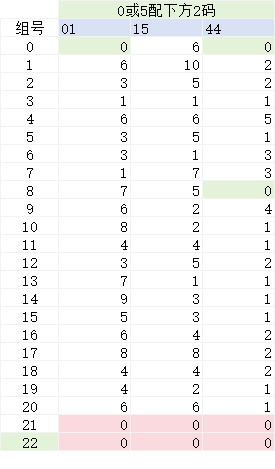 第一组数据是:01,15,44配号码0或者5。