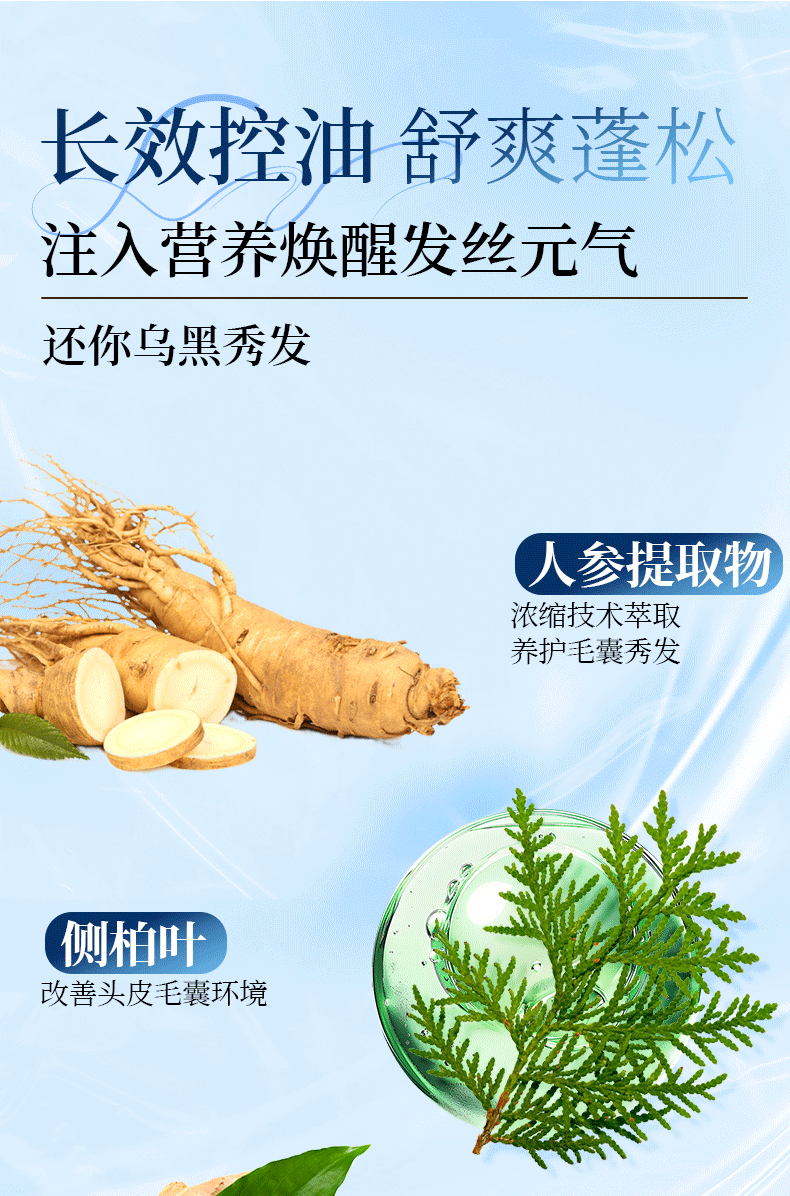 天然植物精粹组合形成多维养护体系:人参提取物含多种人参皂苷,能促进头皮血液循环,为毛囊提供营养供给,延缓毛囊衰老,助力发丝强健;侧柏叶提取物可温和抑制头皮油脂分泌,同时舒缓头皮炎症,调节头皮微生态平衡;姜根提取物能激活毛囊活力,让发根更稳固,增强发丝支撑力,进一步提升蓬松效果;葛根提取物、知母根提取物等则能协同舒缓头皮,减少头皮敏感,让头皮长期处于清爽舒适状态。