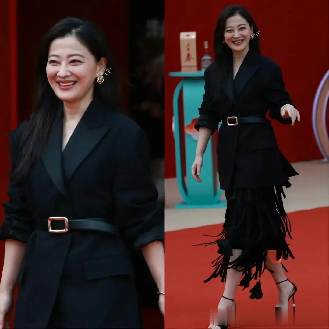 梅婷一头黑色卷发,一身黑色套装,看上去既保暖又干练,走路虎虎生风,神采飞扬,笑容满面,非常有亲和力,体态轻盈,状态好极了,非常有精气神。