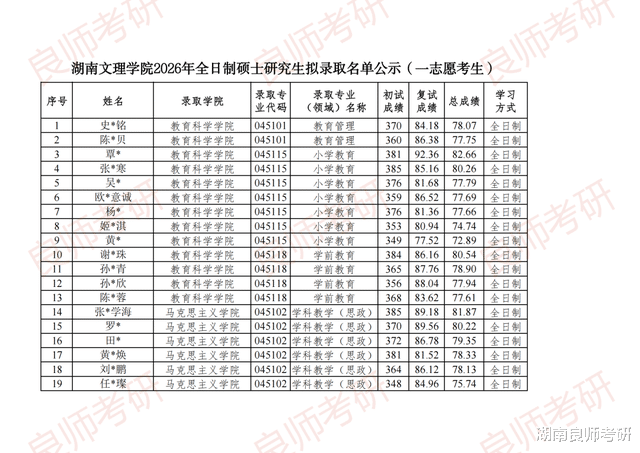 湖南文理学院26考研一志愿拟录取名单