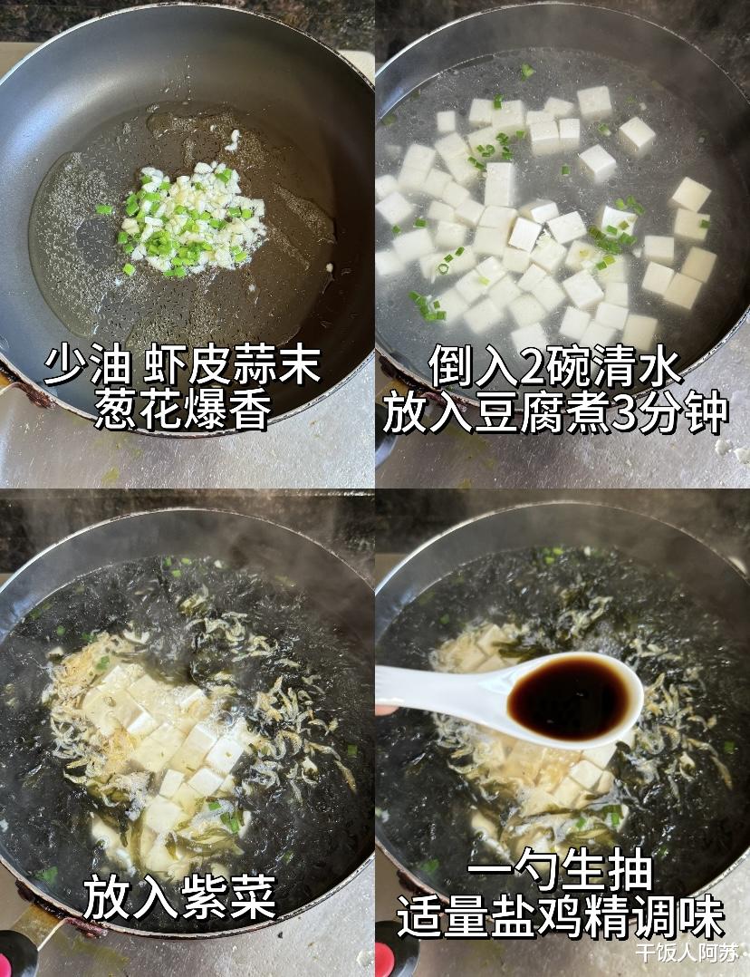 热锅少油,油温五成热时,放入葱花和蒜末,小火煸炒出香味。紧接着加入一小把虾皮,继续翻炒,直到虾皮微微变色,散发出浓郁的鲜香。这一步是汤底鲜味的来源,虾皮的鲜味被油脂激发出来,能极大地提升整道汤的层次感。随后,向锅中倒入两碗清水,大火烧开。水开后,将切好的豆腐块轻轻滑入锅中,转中小火煮约三分钟。豆腐不宜久煮,三分钟足以让其入味,同时保持嫩滑的口感。