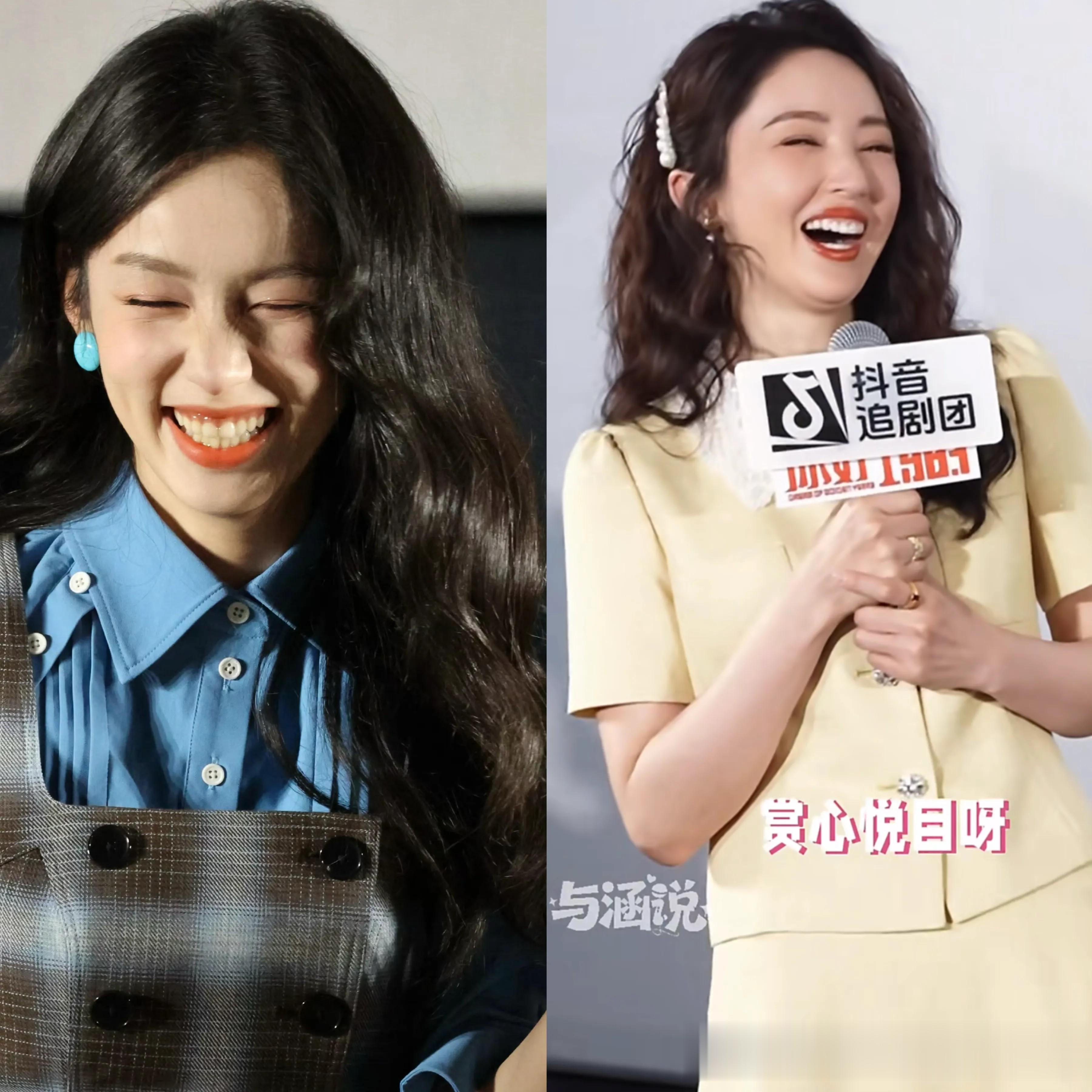 同样是大笑,周也由于太瘦了,颧骨突出,也让她整个脸部线条没有那么饱满流畅。