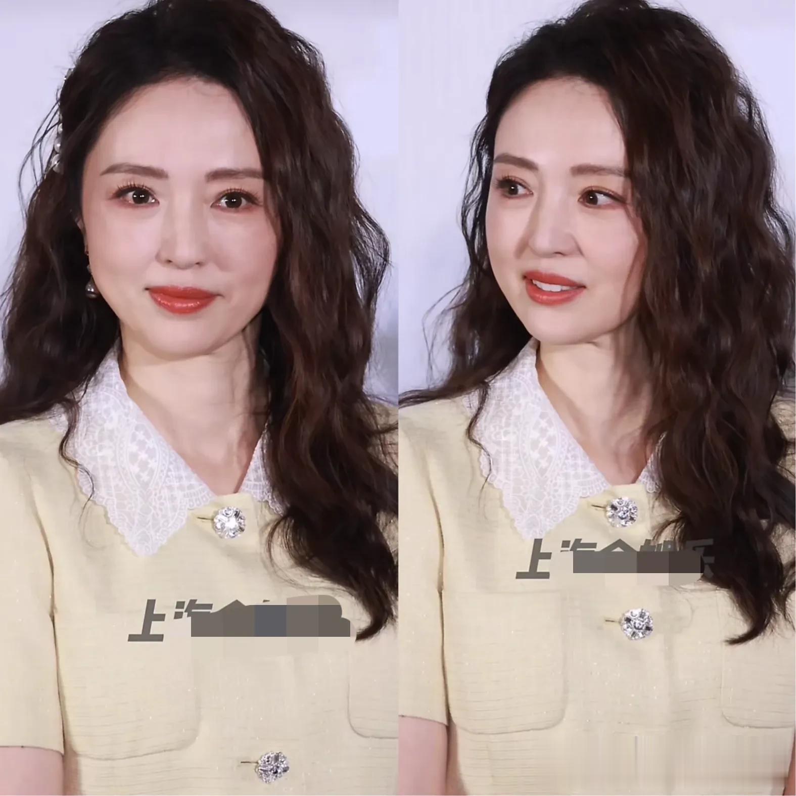 而董璇则身穿一套淡黄色分体裙,搭配一头卷发,看上去特别温婉显气质。