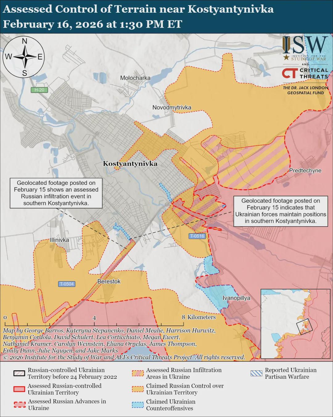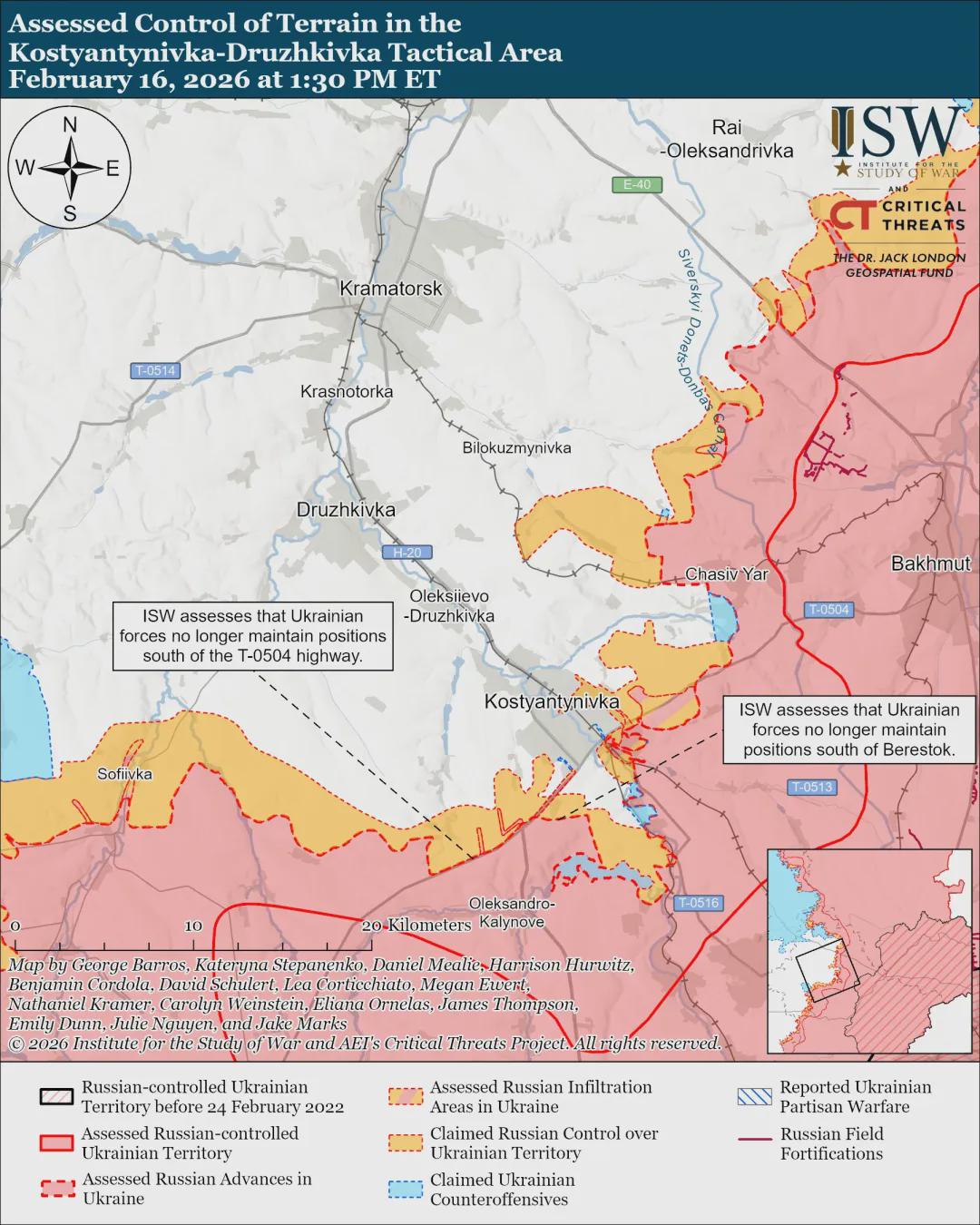 美国战争研究所评估认为,俄军可能在此前某个日期,已经占领了亚布卢尼夫卡(康斯坦丁诺夫卡西南方向)以北和贝雷斯托克(康斯坦丁诺夫卡以南)以南地区