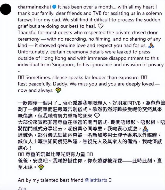 但遗憾的是,还是有名新加坡男士,把其父的丧礼部分细节泄露给香港以外的媒体。对于这位人士的做法,许惠菁深感对方无知同侵犯隐私,认为该名人士的做法,无视他们家人的伤痛。