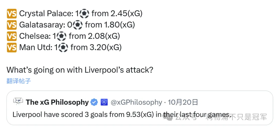 比如在期待进球(xG)这项数据上,利物浦本场期待进球3.2,实际打进了5球,而此前4连败利物浦期待进球合计超过9,却只打进3球。